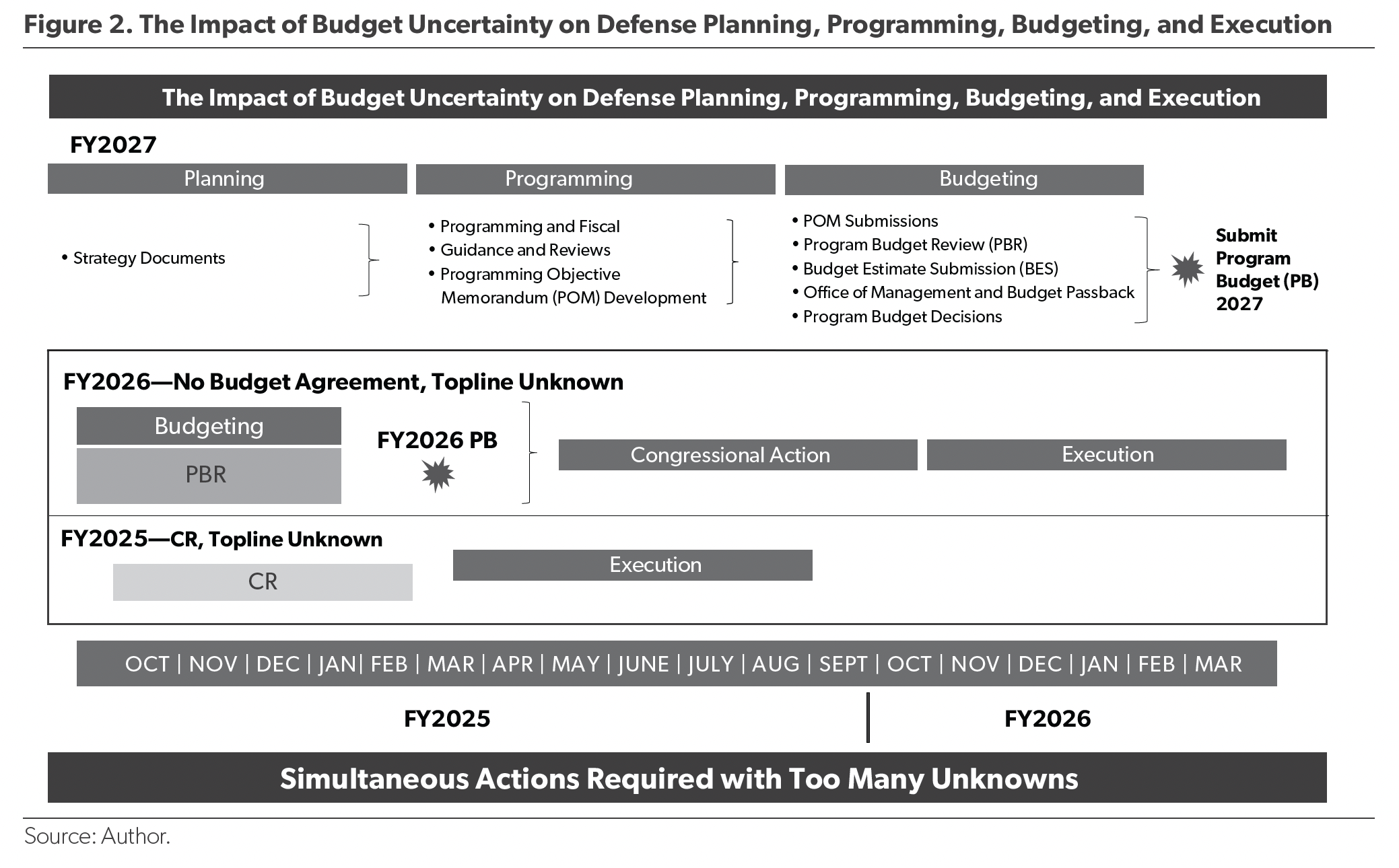 In turning strategic direction into military capability, the military starts planning and programming years before the budget request is actually submitted to Congress. This advance planning is necessary, but it would be more effective if budget agreements set topline discretionary funding levels, even if those caps are modified during the process. Instead, when the DOD begins planning its budget, it often faces three years of uncertainty before the budget even reaches Congress. For example, as the Pentagon plans programs that will be in the FY2027 budget request, it is operating under a CR for FY2025 and is in the budgeting phase of programs for FY2026, which has an unknown topline (Figure 2). This makes such planning a shot in the dark at a near-fictional budget future.