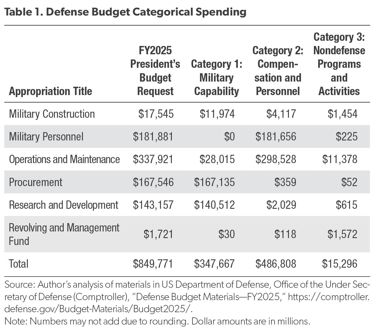 Using a simple methodology to examine the defense budget, Table 1 groups the fiscal year (FY) 2025 request into three categories: (1) military capability and operations, (2) must-pay bills (such as compensation and health care), (3) and missions of other agencies and departments. Even a generous allocation of programs and activities into Category 1 for any efforts that are not clearly defined results in nearly 60 percent of defense spending ($487 billion) falling into Category 2. There, it is consumed by what is essentially mandatory spending, meaning expenses that are tied to previous decisions such as compensation and base operating support, which are not easily changed on an annual basis. More than $15 billion falls into Category 3 and should not be performed by DOD at all. This means that only roughly 40 percent of the annual defense budget is actually discretionary spending that is producing military capability and modernizing the force.