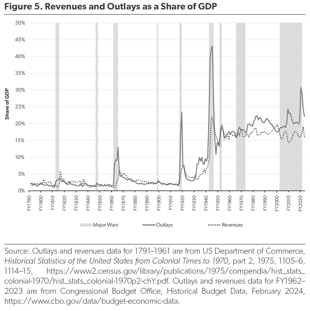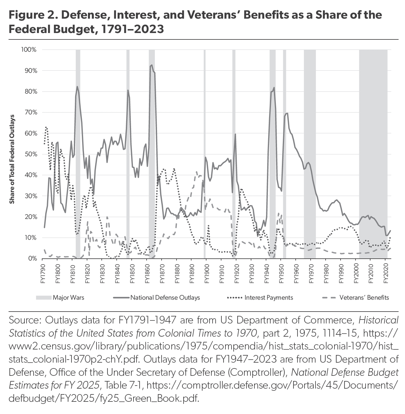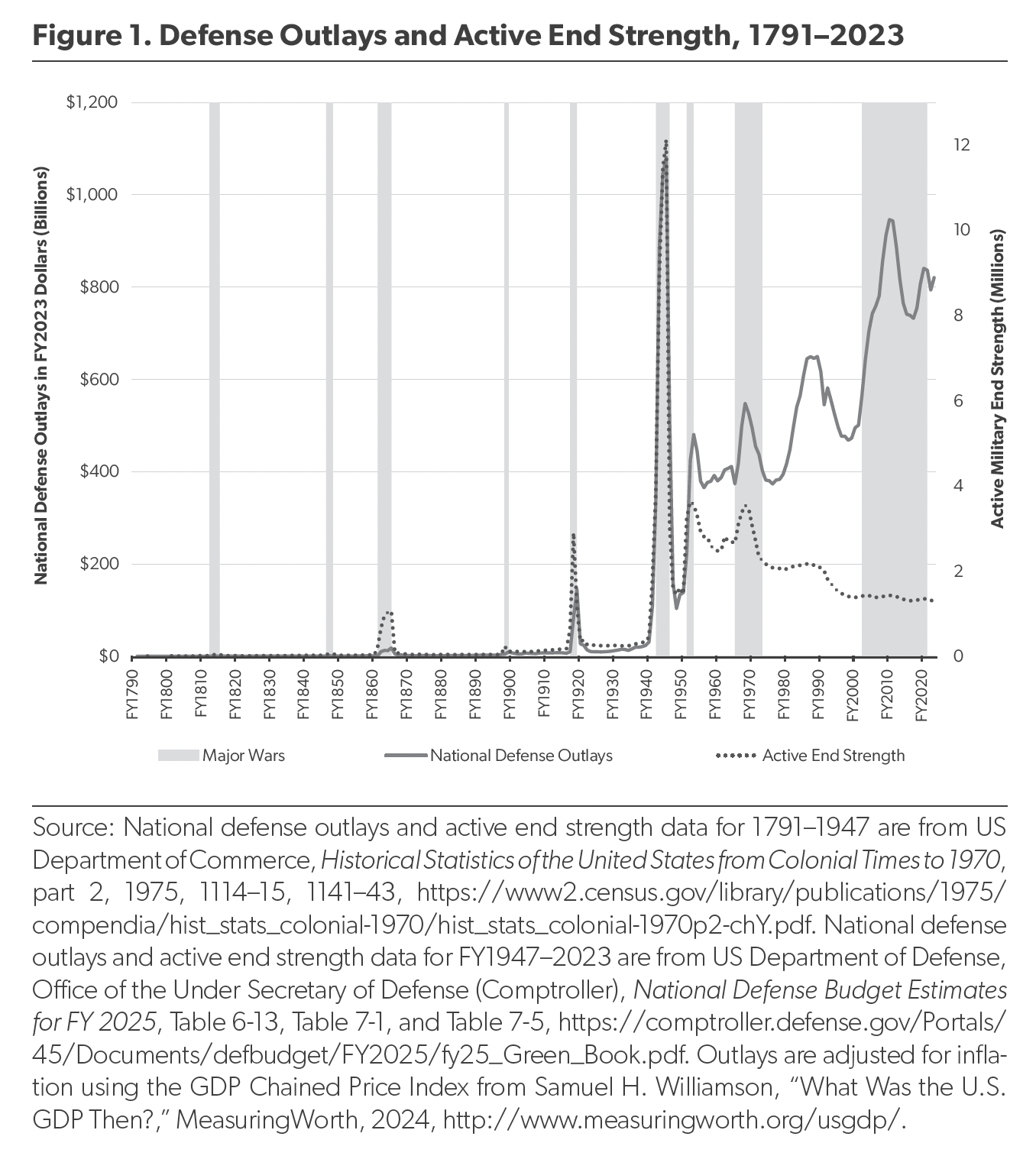 - National defense outlays and active end strength data for 1791–1947 are from US Department of Commerce, Historical Statistics of the United States from Colonial Times to 1970, part 2, 1975, 1114–15, 1141–43, https://www2.census.gov/library/publications/1975/compendia/hist_stats_colonial-1970/hist_stats_colonial-1970p2-chY.pdf. National defense outlays and active end strength data for FY1947–2023 are from US Department of Defense, Office of the Under Secretary of Defense (Comptroller), National Defense Budget Estimates for FY 2025, Table 6-13, Table 7-1, Table 7-5, https://comptroller.defense.gov/Portals/45/Documents/defbudget/FY2025/fy25_Green_Book.pdf. GDP data are from Williamson, “What Was the U.S. GDP Then?”