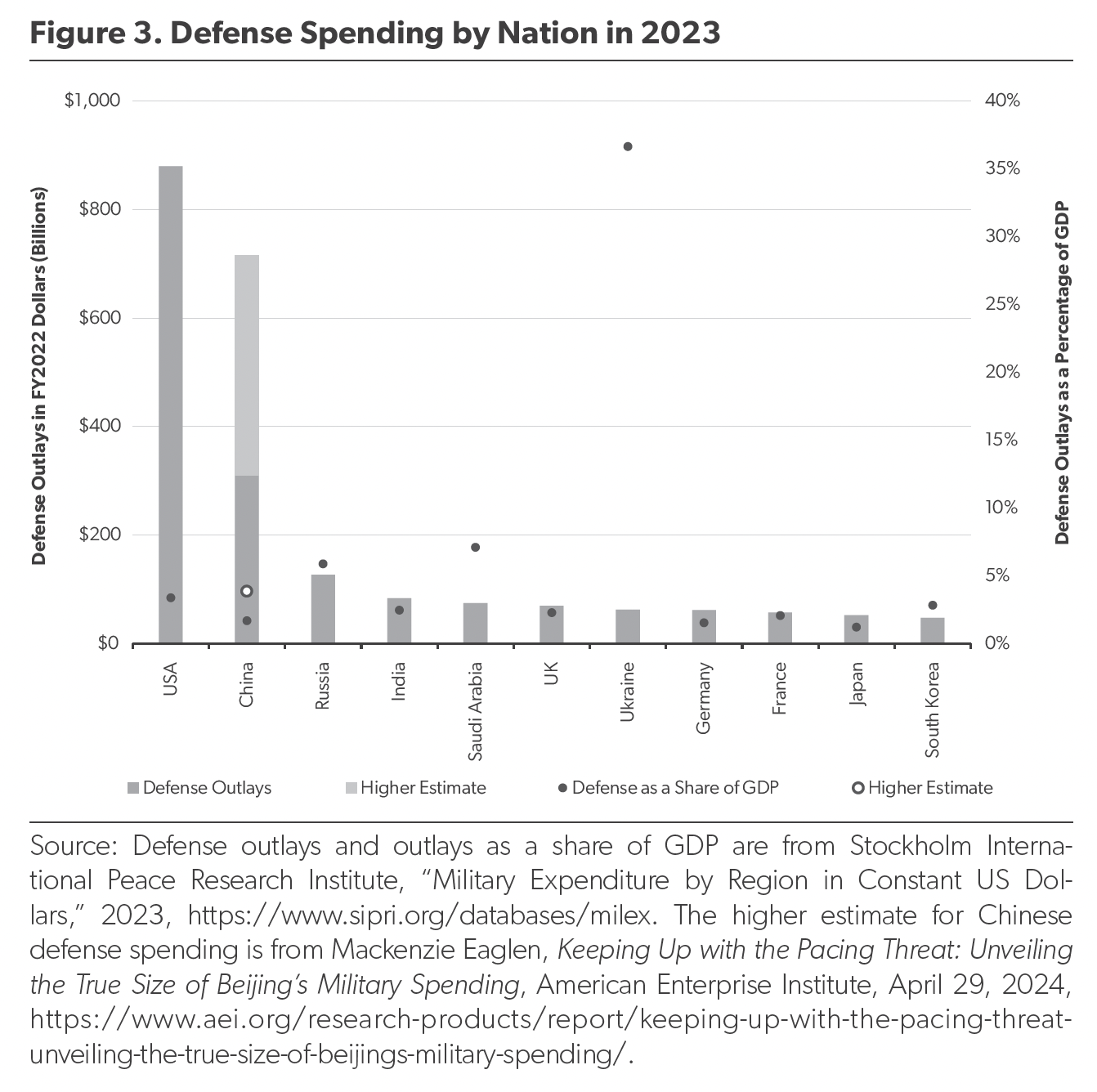 The debate over the level of defense spending often references how much the United States spends on defense relative to other nations. Such a comparison, however, is difficult to make because we do not always know with accuracy what other nations spend on defense, labor and material costs vary significantly among nations, and the way countries categorize defense and nondefense spending varies. As shown in Figure 3, estimates for China’s defense spending range from $309 billion to $711 billion (in 2022 US dollars).16 Although China is quickly catching up, the United States still spends more than any other nation on defense. As a share of GDP, though, the United States spends less than many other nations—Ukraine, Russia, Saudi Arabia, Israel, and others devote much more of their economy to defense.