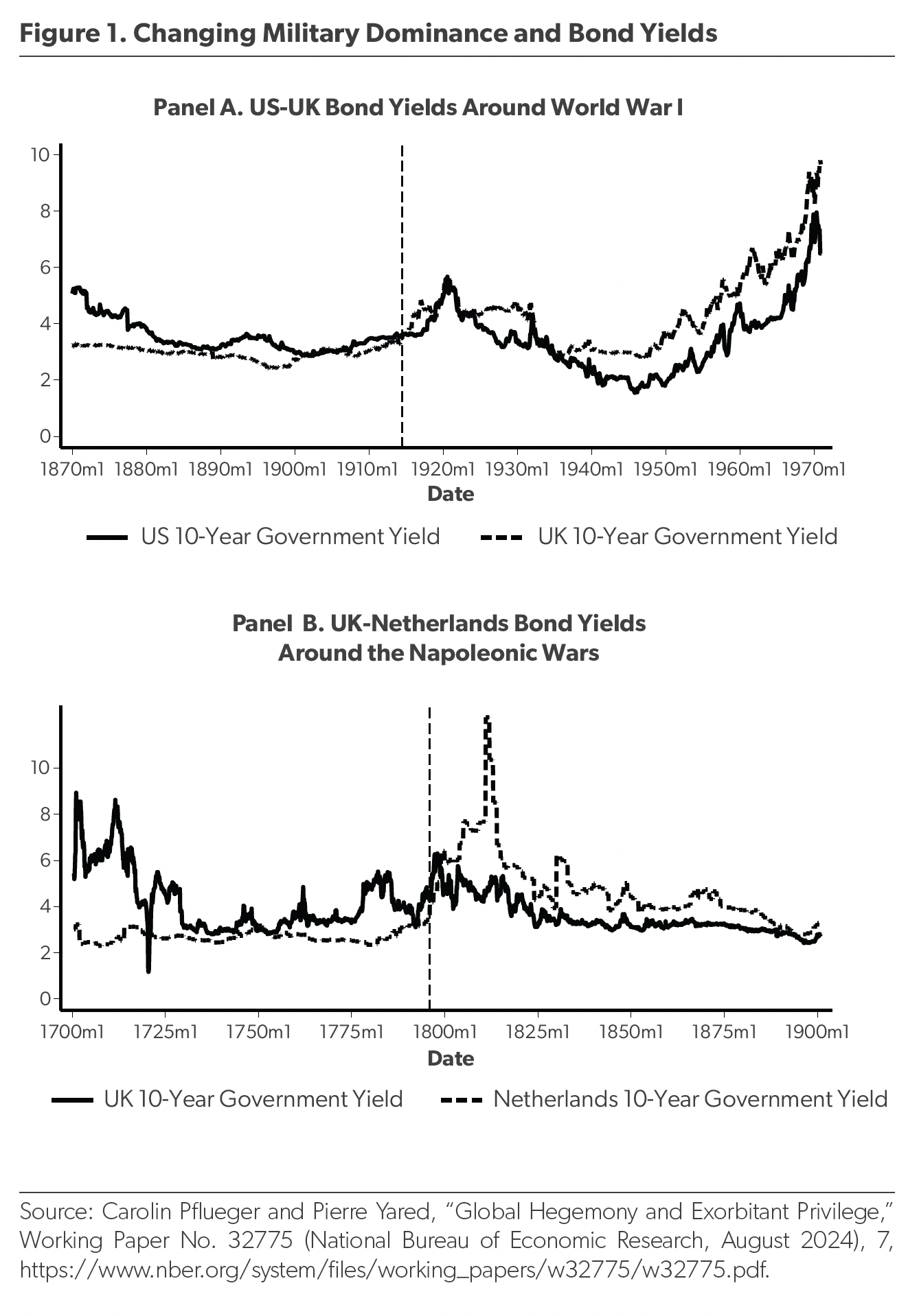 To demonstrate the funding advantage of military hegemons, economists Carolin Pflueger and Pierre Yared study the interest rates on government debt around the time of hegemonic transitions. Specifically, they study the transition in hegemonic regimes from Great Britain to the United States in the period spanning the First and Second World Wars and the transition at the end of the 18th century from the Netherlands to Great Britain.13