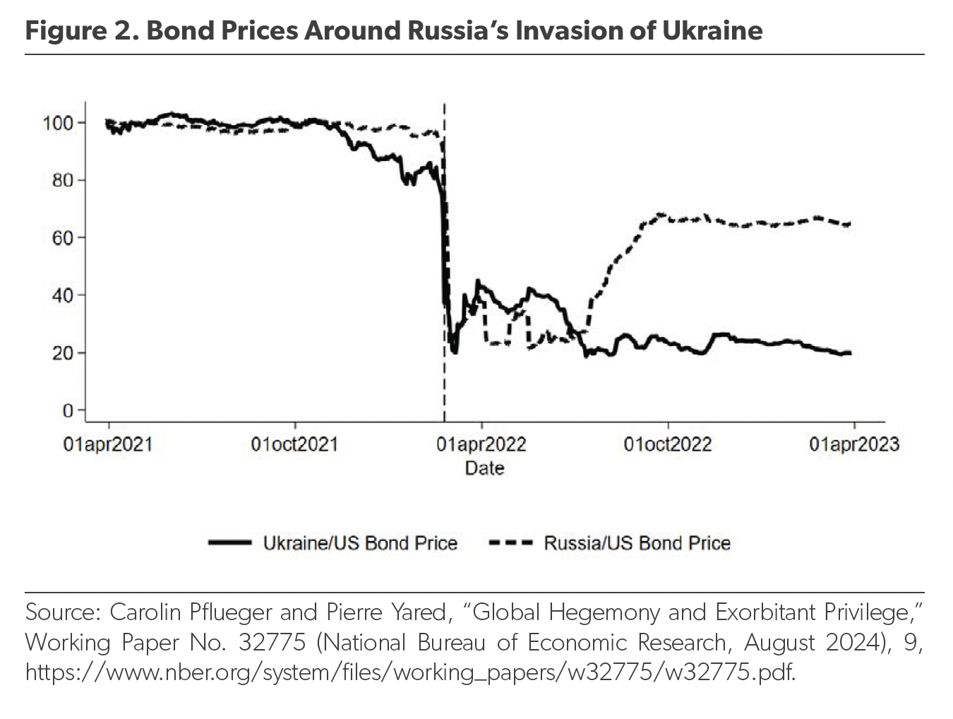 Pflueger and Yared also find that the funding advantage enjoyed by a hegemon increases as the risk of military conflict increases. Moreover, the hegemon’s funding advantage may increase even if the conflict does not directly involve the hegemon. In Figure 2, Pflueger and Yared demonstrate that the United States’ funding advantage relative to both Russia and Ukraine increased following Russia’s invasion of Ukraine in February 2022.