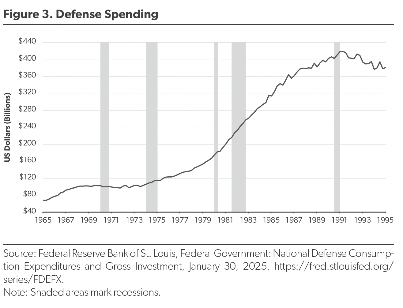 Strategic Competition. As shown in Figure 3, President Ronald Reagan increased defense spending by 57 percent between 1981 and 1985 in order to win the arms race with the Soviet Union. Analogously, the US might characterize its optimal defense spending as a target relative to China’s defense spending—say, 180 percent of Chinese spending,24 or the growth rate of China’s spending plus a markup.